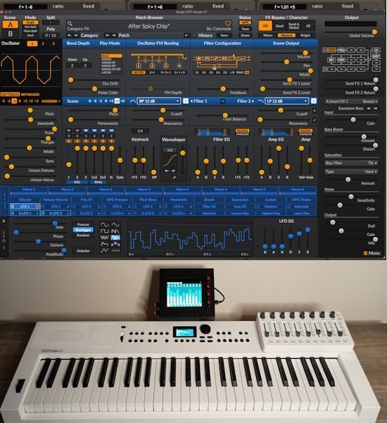 O SurgeXT utiliza um algoritmo de síntese híbrida subtrativa. Cada patch contém duas "cenas", que são instâncias separadas de todo o mecanismo de síntese (exceto efeitos), que podem ser usadas para sobrepor ou dividir patches.